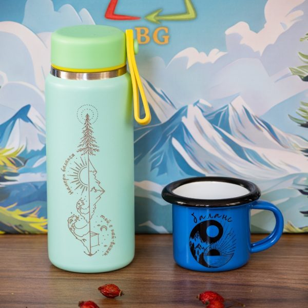 Лазерно гравиран метален термос с вместимост от 200мл и дизайн „Намери баланса, той е най-важен“.